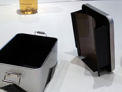 Naさんは2台の新作カメラを披露。一つはネットで見つけたロック付きの金属製ランチボックスで作った針穴径0.25oの4x5用カメラ。フィルムの装填位置を焦点距離30-40-50-60mmのところにそれぞれ設けてあり、さらにフィルムの両サイドにアタッチメントを取り付ければフィルムを湾曲させてセットできる仕組み。もう1台も同様に針穴径0.25o、4種の焦点距離ですが、さらに一番奥の部分に交換用の新しいフィルムと撮影済みのフィルムをストックするコンパートメントを設けて、ダークバッグの中でフィルム交換することを想定した構造ですが、こちらは3Dプリンタで制作しました。 |
