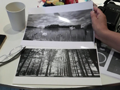 Enさんは、今回はゾーンプレートではなく、以前Saさんが制作してくれたパノラマの針穴カメラで撮影した、花の咲く水元公園の水辺の景色や木々のモノクロの針穴写真を披露しました。来年春にはゾーンプレート仲間でグループ展を計画しているとのことです。 |